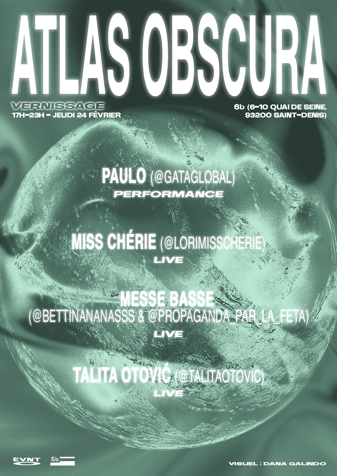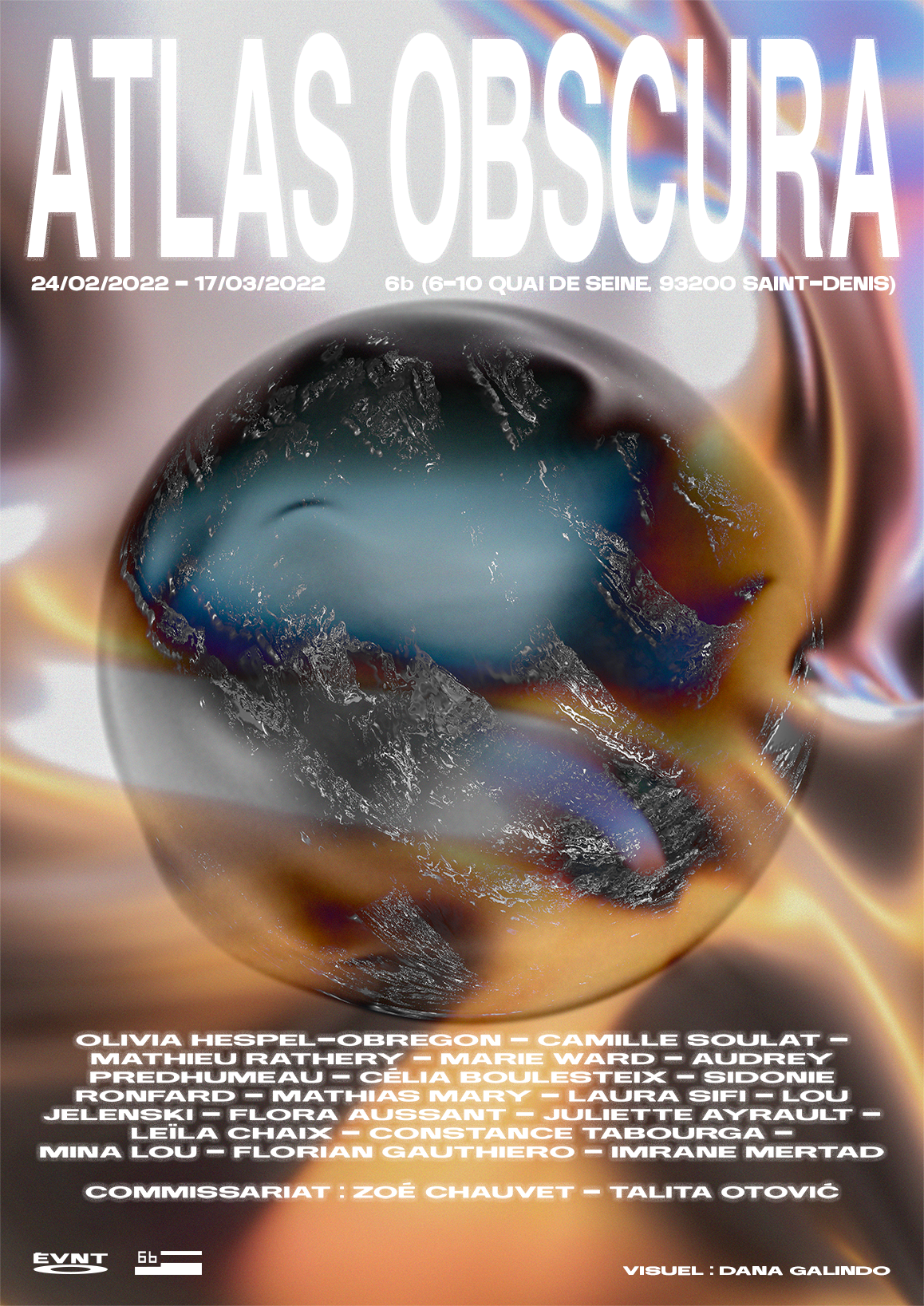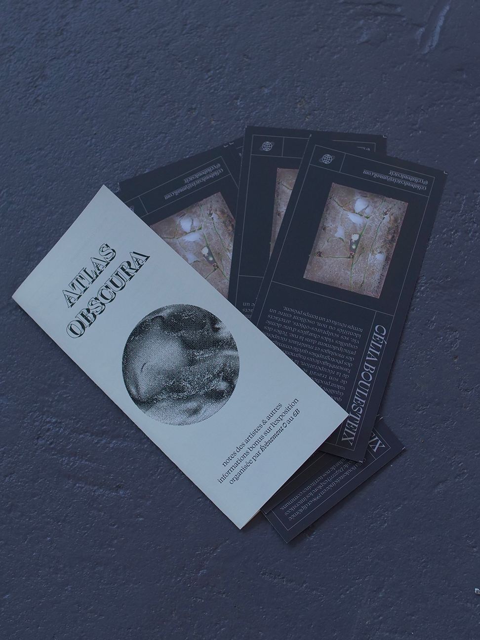 Identité visuelle et objets de communication web et imprimé de l'exposition Atlas Obscura, organisée par le collectif Évènement 0 au 6B (Saint-Denis)