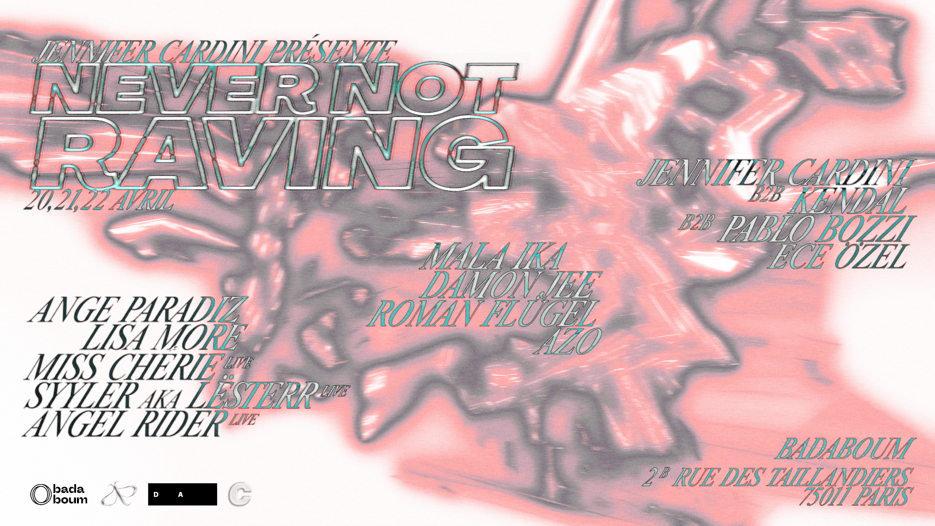 Identité visuelle & merch du festival 'Never not raving' organisé par Jennifer Cardini au Badaboum à Paris. Chaque soirée présentait l'un des label de la dj, tous spécialisés en musique électronique.